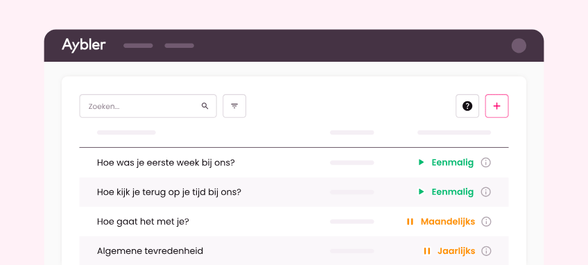 Betere en gerichtere gesprekken houden met je medewerkers? Hogere betrokkenheid en werkplezier creëren? En op tijd signalen opvangen om uitstroom te voorkomen? Met de medewerker feedbacktool in Aybler verzamel je eenvoudig waardevolle inzichten over hoe het écht gaat op de werkvloer. Met de medewerker feedbacktool verzamel je eenvoudig waardevolle inzichten. Maak in een handomdraai vragenlijsten op maat en deel ze direct met medewerkers via e-mail of pushbericht. Medewerkers kunnen laagdrempelig reageren, waar en wanneer het hen uitkomt. Zo beschik je altijd over actuele feedback om gericht te kunnen sturen.